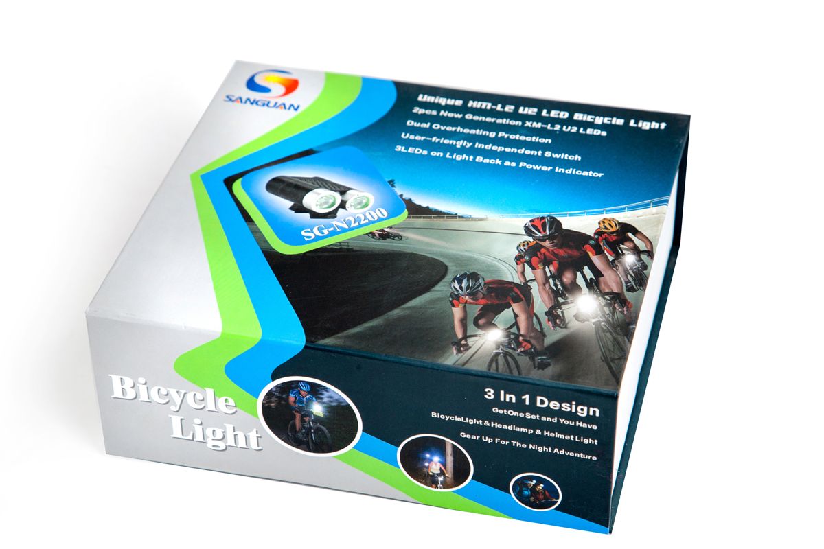 Фонарь SANGUAN SG-N2200 образует мощное равномерное освещение на расстоянии до 50 метров. Стоит отметить полное отсутствие световых границ между зонами освещения, что очень комфортно для глаз. 2 светодиода работают от выносного блока аккумуляторов (6600mAh, 7,4V) который можно заряжать от сети 220В, с помощью зарядного устройства. Сила светового потока 2200лм. 4 режима работы: 100%, 70%, 40%, 10%. Класс влагозащиты IP66. Выносная кнопка может быть размещена в наиболее удобном месте руля, длина провода кнопки около 30см. Индикатор заряда имеет три светодиода и сообщает об уровне заряда аккумулятора на уровне 100%(зелёный), 50%(синий), 10%(красный). Заряда аккумулятора 10% хватает примерно на 30 минут работы. Фонарь может быть закреплён на руль велосипеда (резиновыми хомутами), на голову велосипедиста или на шлем, с помощью налобного крепления.